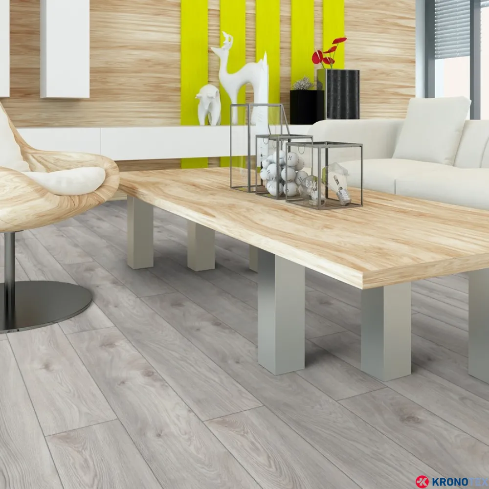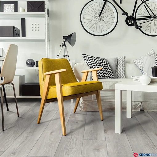 Особенностью ламината Kronotex Mammut (Кронотекс Маммут) является длинная доска с фаской по всему периметру, которая придает покрытию дополнительную элегантность и глубину. Благодаря реалистичному воспроизведению структуры древесины, ламинат выглядит как натуральный дуб. Светлые, мягкие оттенки бело-бежевого цвета, напоминающие морскую пену, делают помещение свежим и уютным.