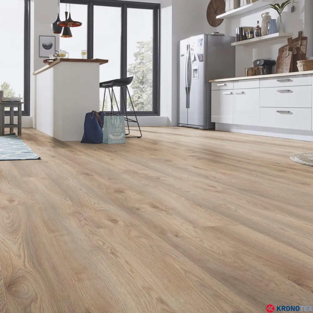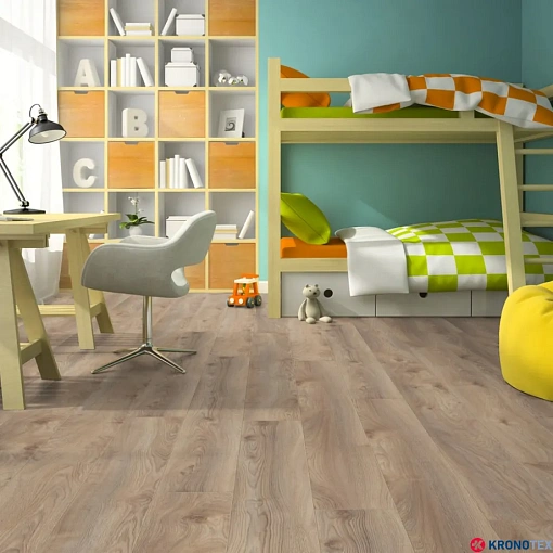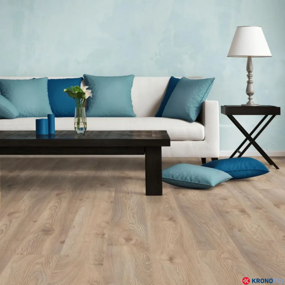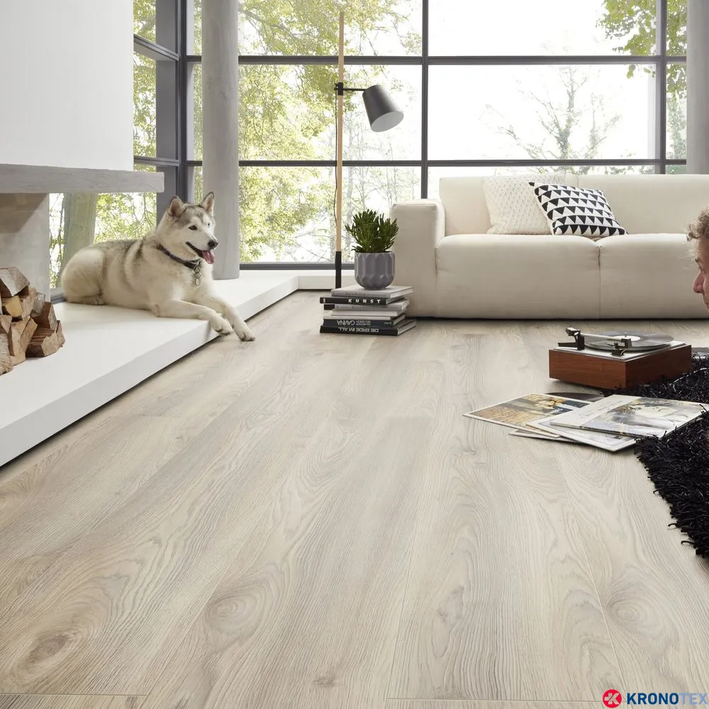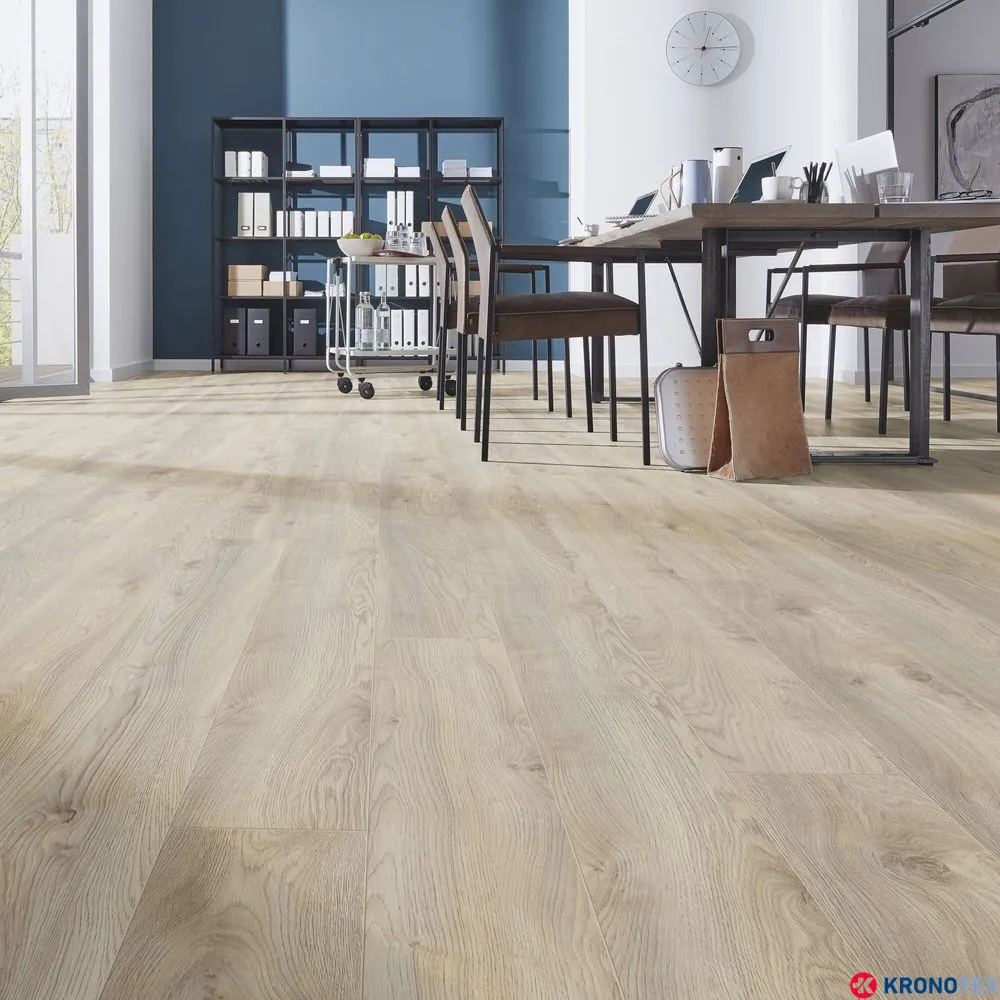 Особенностью ламината Kronotex Mammut (Кронотекс Маммут) является длинная доска с фаской по всему периметру, которая придает покрытию дополнительную элегантность и глубину. Благодаря реалистичному воспроизведению структуры древесины, ламинат выглядит как натуральный дуб. Светлые, мягкие оттенки бело-бежевого цвета, напоминающие морскую пену, делают помещение свежим и уютным.