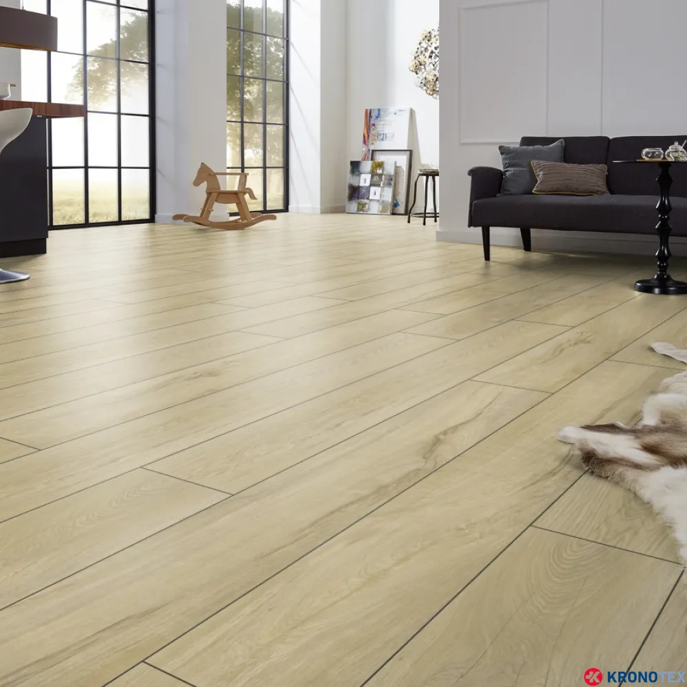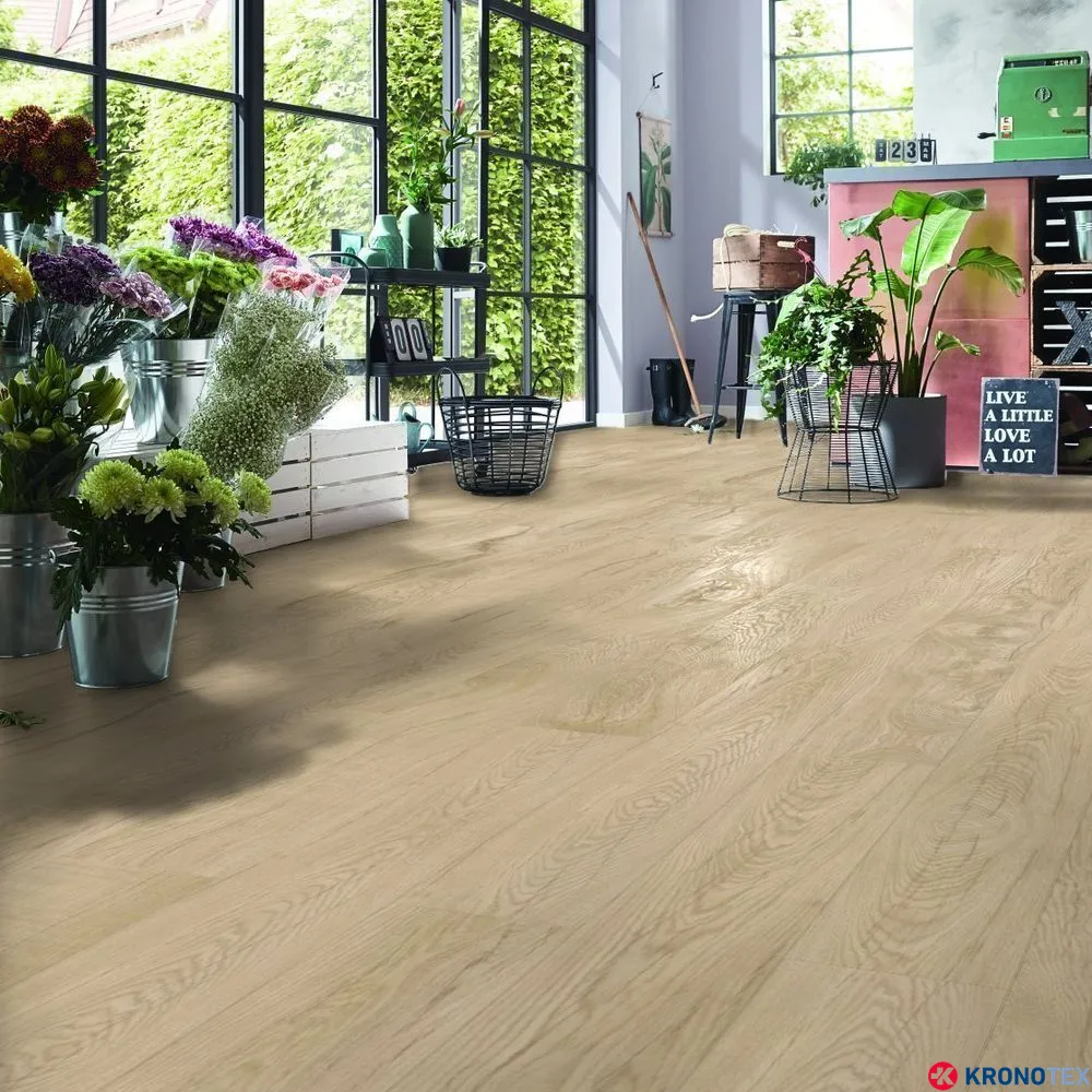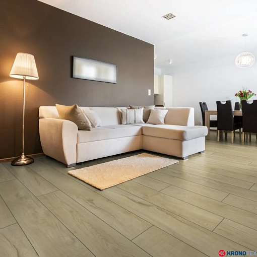 Благодаря длинному и широкому формату доски с фасками по периметру, ламинат Kronotex Mammut Plus (Кронотекс Маммут Плюс) создает эффект массивного пола и придает помещению изысканный и современный вид. Структура ламината точно воспроизводит текстуру дуба, а бежевый цвет с легкими цветовыми переходами подчеркивает характер текстуры дерева. Чрезвычайно устойчивая поверхность ламината обеспечивает защиту от царапин и повреждений, а высокая плотность плиты делает его стабильным и прочным.
