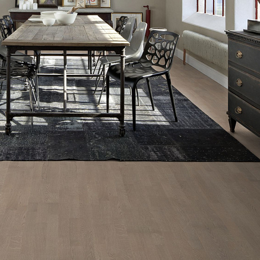 Трехполосная доска из отборного дуба, сочетающая в себе светлые оттенки серого. Чистый и ровный цвет подчёркнут лёгкой обработкой щеткой, морением и покрытием цветным маслом.