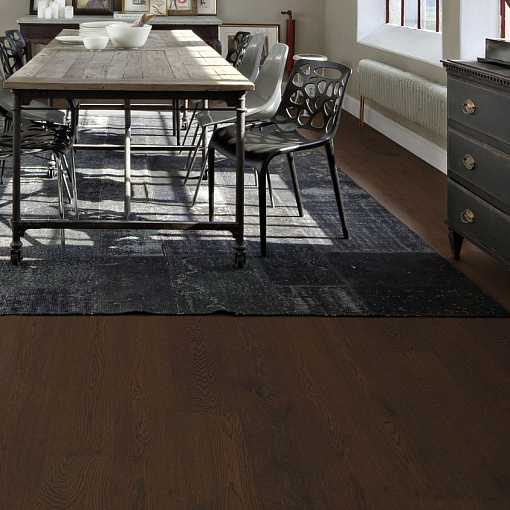 Темно-коричневый паркет обработан щеткой и покрыт матовым лаком. Четырехсторонняя фаска по краям усиливает классический вид цельной доски.