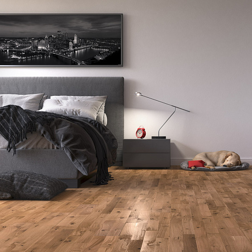 Трехполосная доска из дуба в стиле Кантри, покрыта светло-коричневым маслом. Допускается: редкая заболонь; сердцевинные лучи; темные полосы; сросшие и зашпатлеванные сучки.
