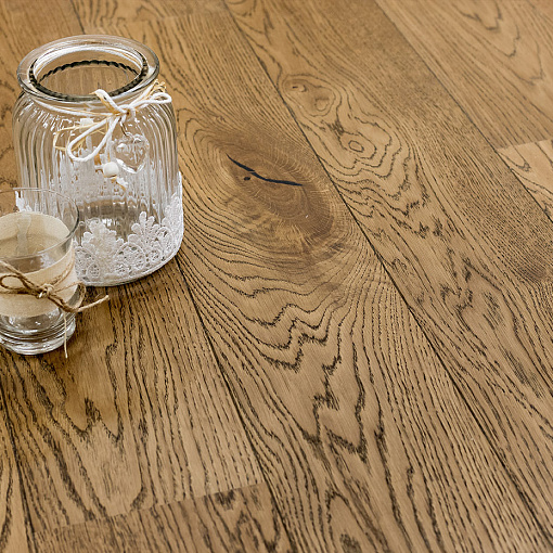 Легко брашированная однополосная доска из дуба сортировки Кантри, покрыта коричневым маслом. Допускается: разнотон; редкая заболонь; сердцевинные лучи; темные полосы; сучки, в том числе не полностью зашпатлеванные.