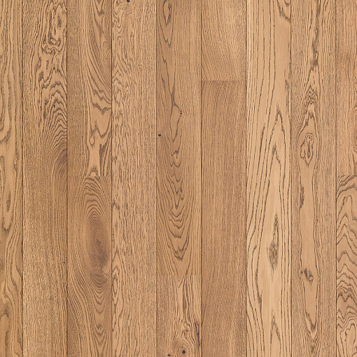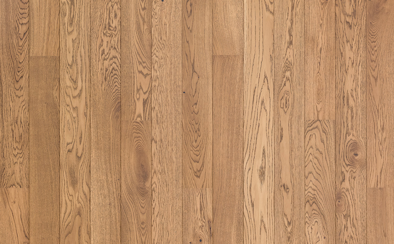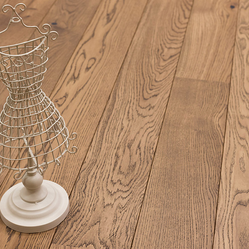 Легко брашированная однополосная доска из дуба сортировки Кантри, покрыта светло-коричневым маслом. Допускается: разнотон; редкая заболонь; сердцевинные лучи; темные полосы; сучки, в том числе не полностью зашпатлеванные.
