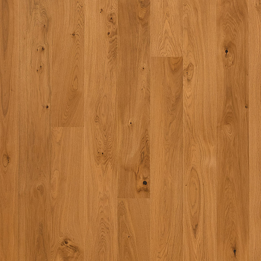 Однополосная доска из дуба сортировки Кантри, покрыта коричневым матовым лаком. Допускается: разнотон; редкая заболонь; сердцевинные лучи; темные полосы; зашпатлеванные сучки.