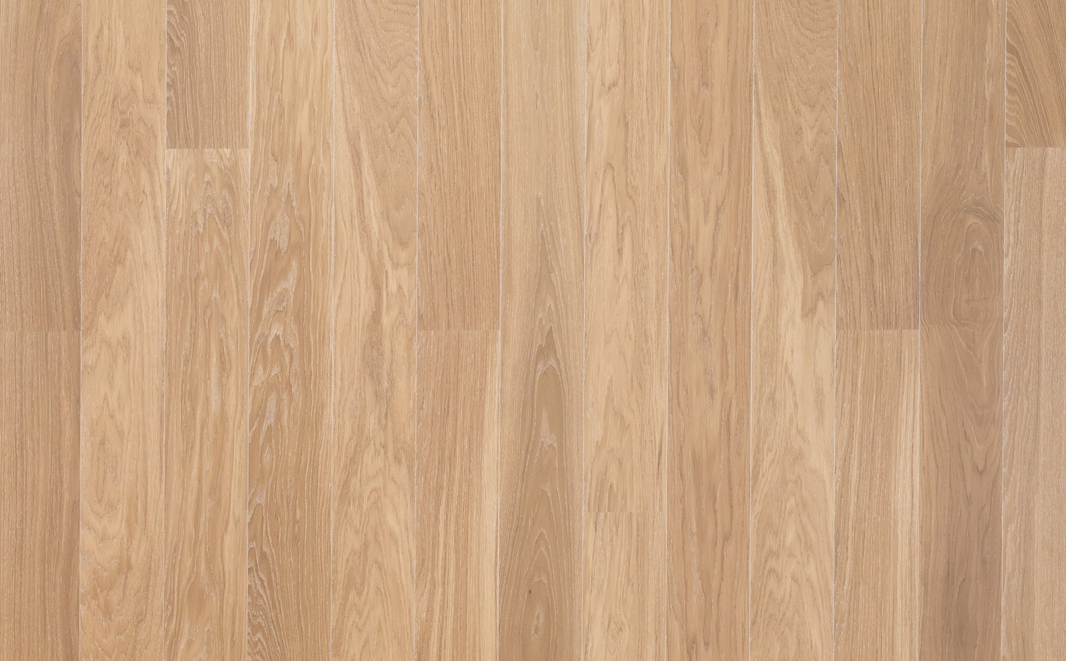 Легко брашированная однополосная доска из отборного дуба под белым маслом. Допускается: разнотон; заболонь; сердцевинные лучи; редкие сросшиеся сучки; групповые булавочные сучки.