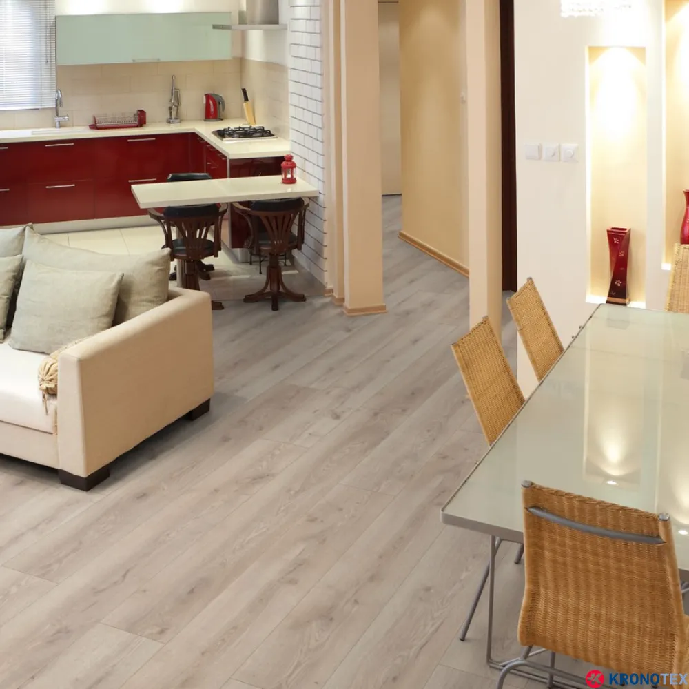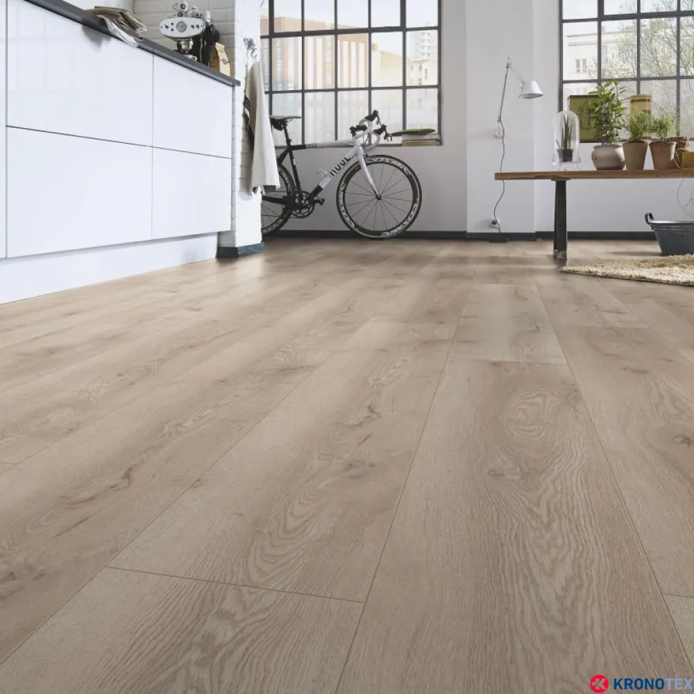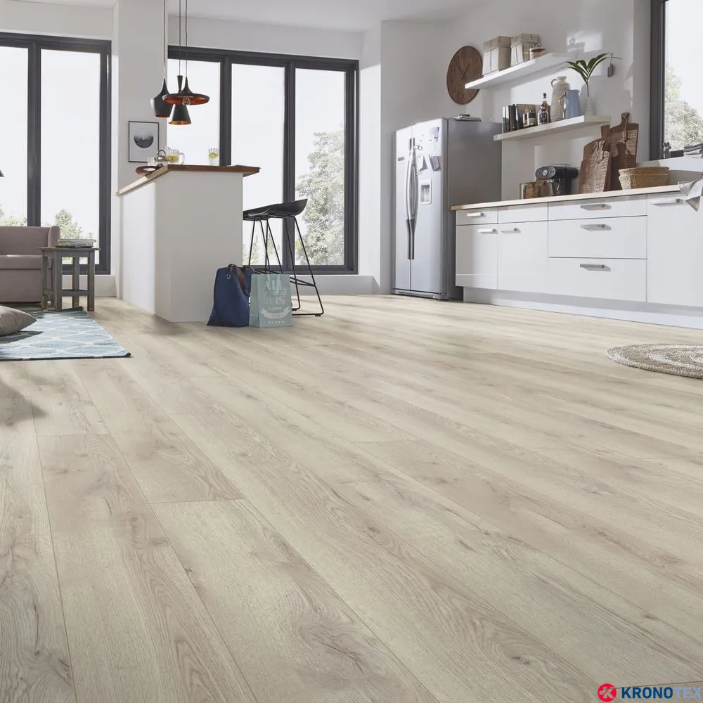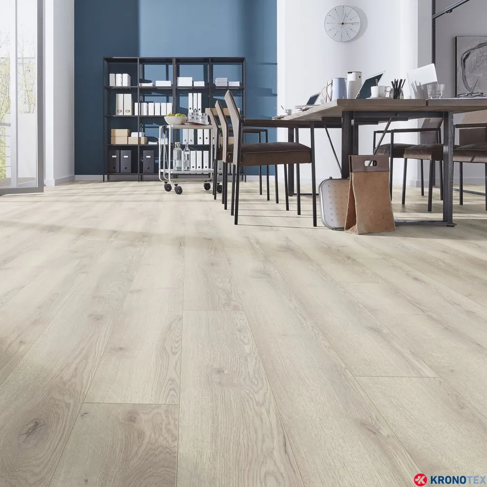 Особенностью ламината Kronotex Mammut (Кронотекс Маммут) является длинная доска с фаской по всему периметру, которая придает покрытию дополнительную элегантность и глубину. Благодаря реалистичному воспроизведению структуры древесины, ламинат выглядит как натуральный дуб. Светлые, мягкие оттенки бело-бежевого цвета, напоминающие морскую пену, делают помещение свежим и уютным.