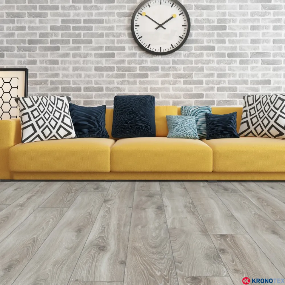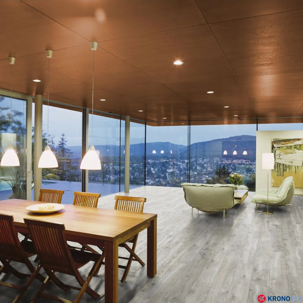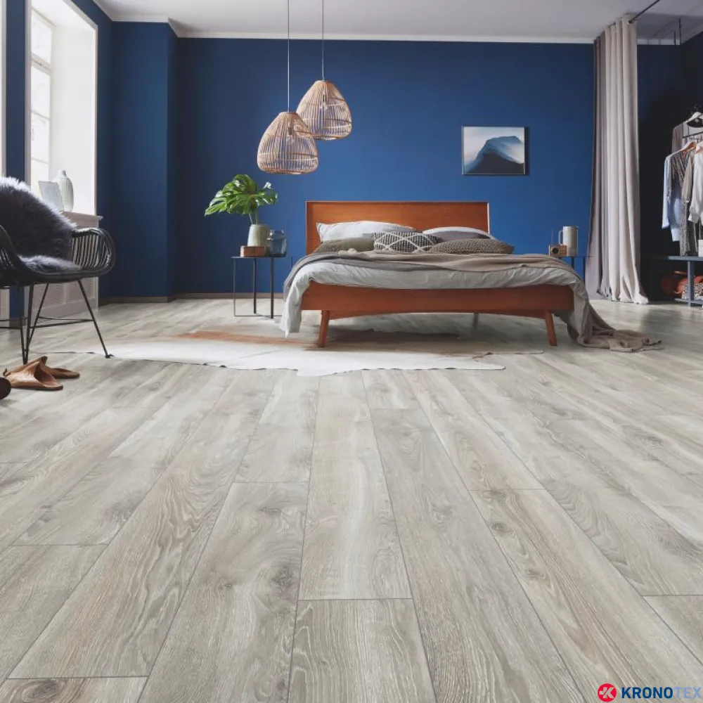 Особенностью ламината Kronotex Mammut (Кронотекс Маммут) является длинная доска с фаской по всему периметру, которая придает покрытию дополнительную элегантность и глубину. Благодаря реалистичному воспроизведению структуры древесины, ламинат выглядит как натуральный дуб. Светлые, мягкие оттенки бело-бежевого цвета, напоминающие морскую пену, делают помещение свежим и уютным.