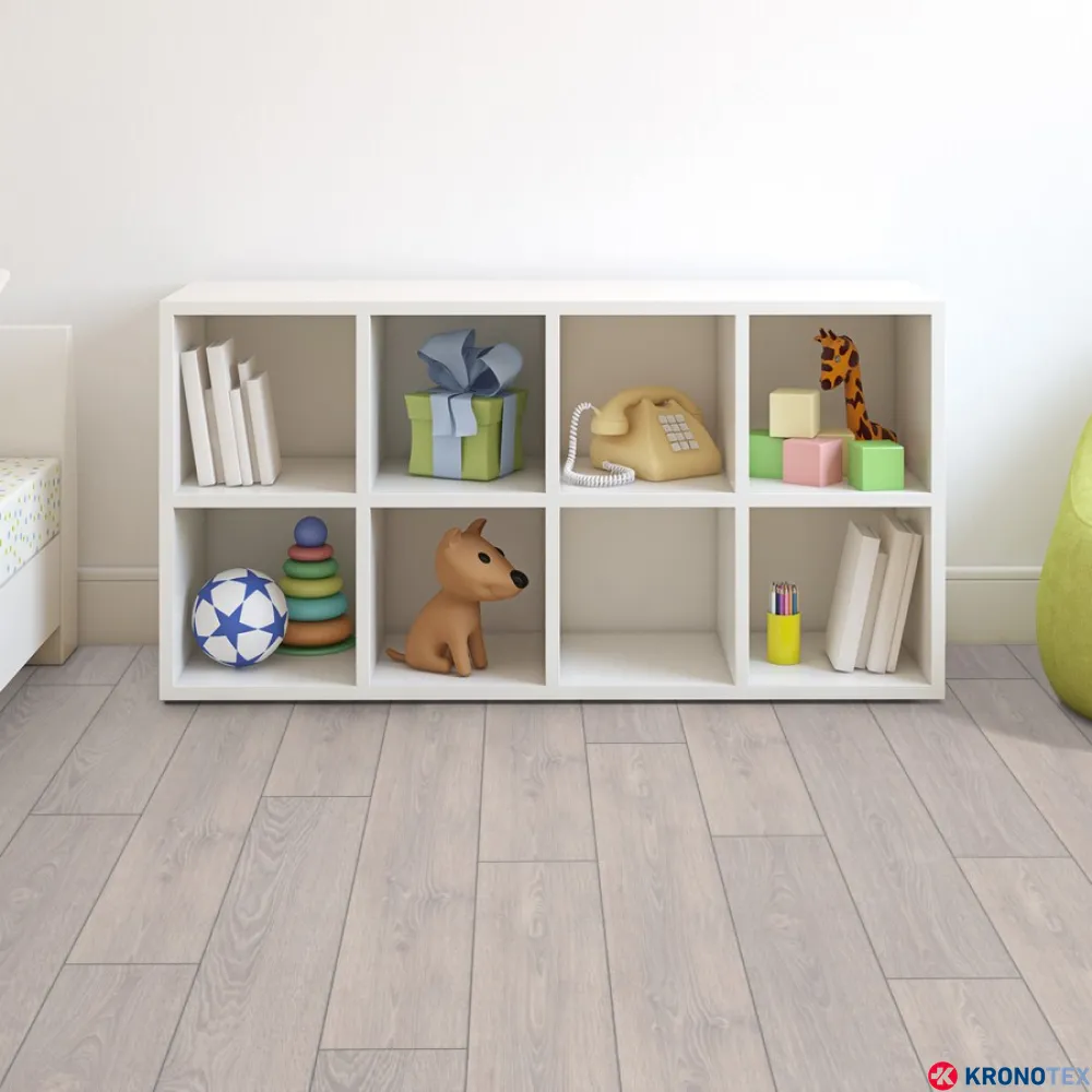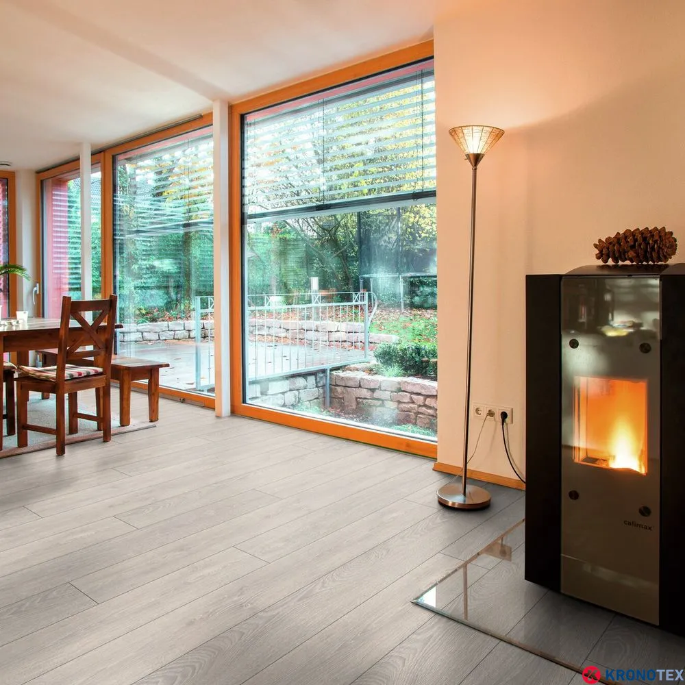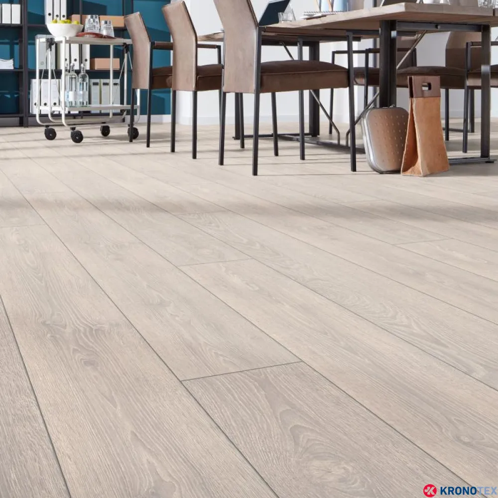 Особенностью ламината Kronotex Mammut (Кронотекс Маммут) является длинная доска с фаской по всему периметру, которая придает покрытию дополнительную элегантность и глубину. Благодаря реалистичному воспроизведению структуры древесины, ламинат выглядит как натуральный дуб. Светлые, мягкие оттенки бело-бежевого цвета, напоминающие морскую пену, делают помещение свежим и уютным.